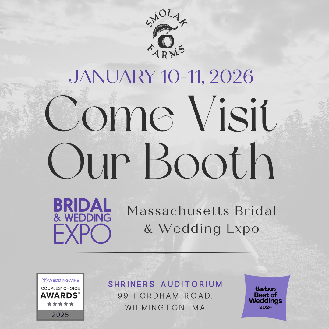 Kickstart your wedding planning with Smolak Farms at the Massachusetts Bridal & Wedding Show on January 10 & 11. Experience our signature rustic farm charm, breathtaking New England scenery, and meet the team dedicated to making your day effortless. While you’re there, ask about our limited prime fall 2026 dates, as well as openings in summer 2026 and beyond. From the first look to the last dance, we create moments you and your guests will never forget.