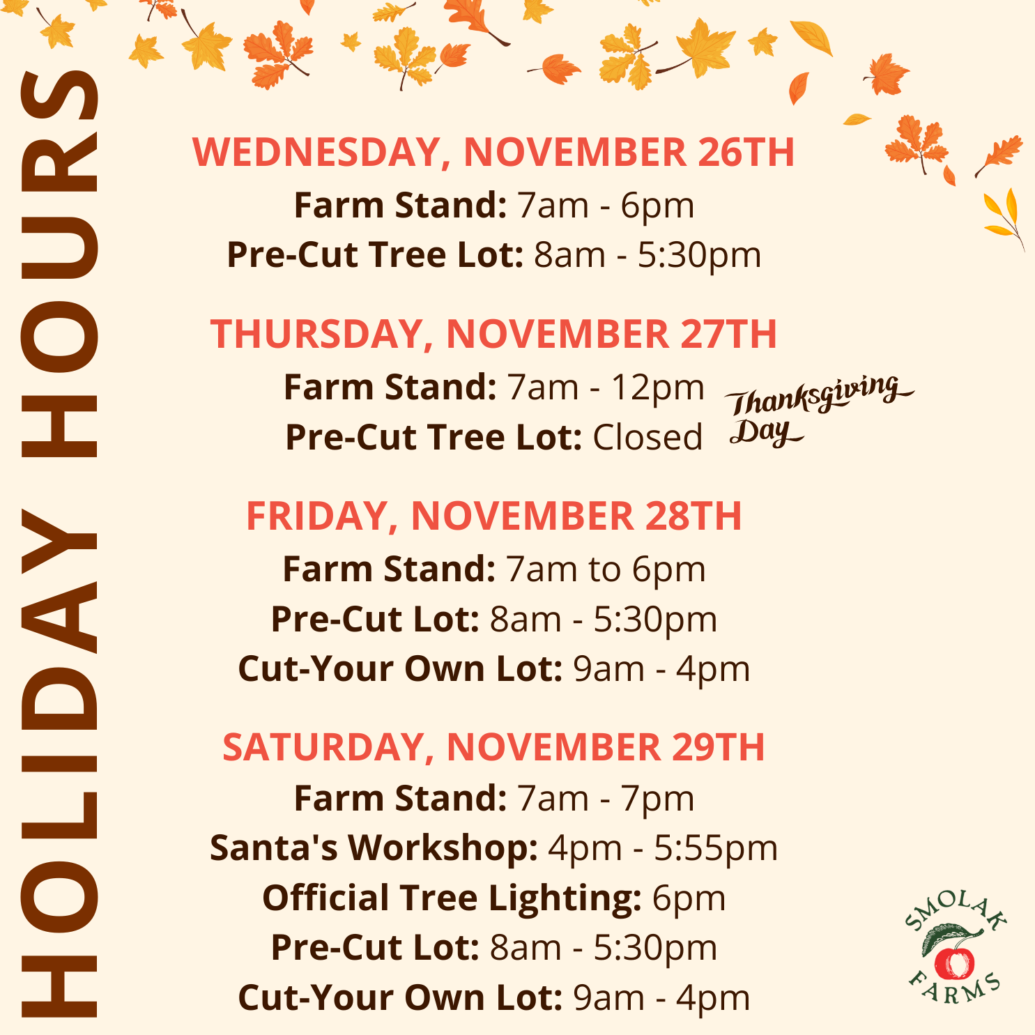 Black Friday (November 28): Buy any tree and get 10% off one Farm Stand Christmas décor item.