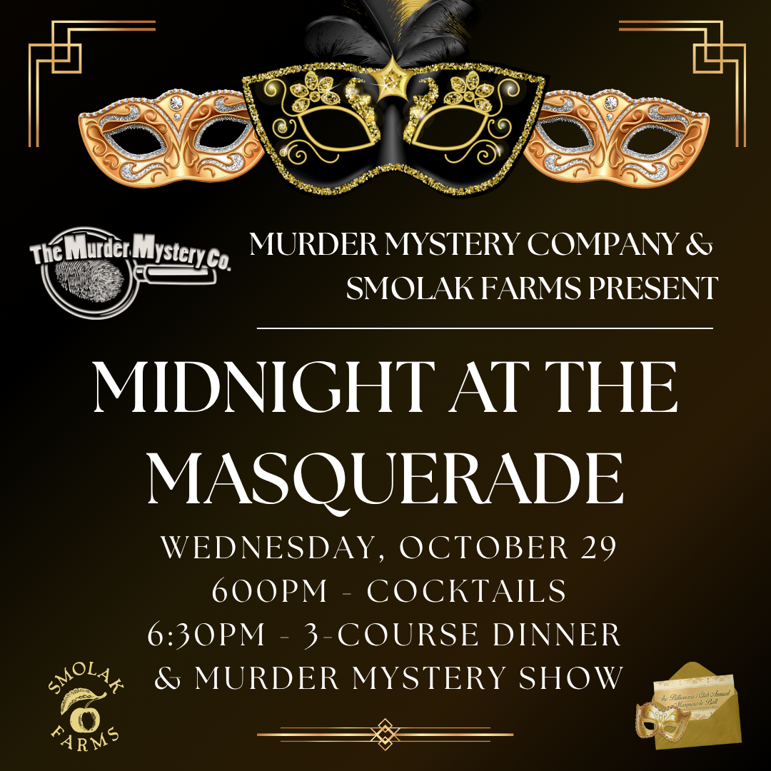 Smolak Farms 315 South Bradford Street, North Andover, MA, United StatesStep into an evening of intrigue, elegance, and suspense as Smolak Farms hosts Midnight at the Masquerade – an interactive Murder Mystery Night presented by The Murder Mystery Company, as featured on Shark Tank. Dine among the elite at the Billionaires’ Club Annual Masquerade Ball, where glamour and mystery intertwine … and one guest won’t make it to midnight. Trade clues, question suspects, and uncover secrets as you work to solve the crime before the culprit slips away. Wednesday, October 29 Doors at 6PM | Dinner at 6:30PM Smolak Farms (North Andover, MA) $90 per person – includes a three-course [...]