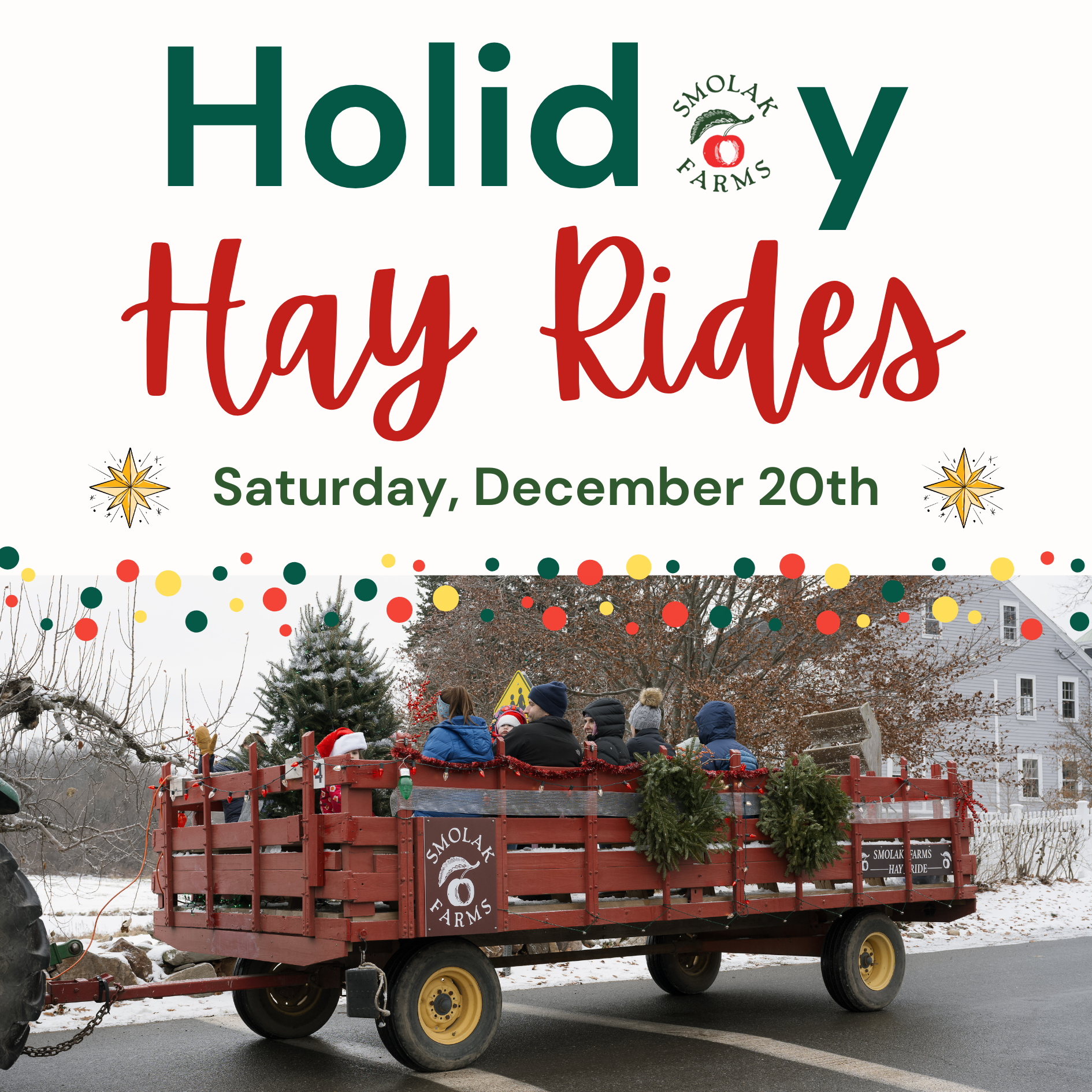 Smolak Farms 315 South Bradford Street, North Andover, MA, United StatesCome out this Saturday, December 20th for a special Holiday Hayride at Smolak Farms! Tickets are $7 per person. After your ride, make sure to stop by the Farm Stand, Christmas Tree Lot, and explore the rest of the farm!