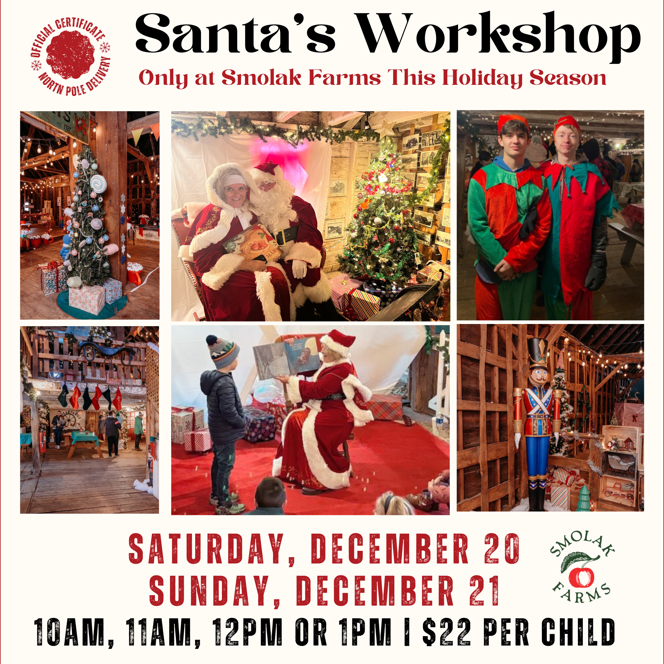 Smolak Farms 315 South Bradford Street, North Andover, MA, United StatesStep into the magic of the season at our annual Santa’s Workshop in the Barn – a festive, hands-on holiday experience for kids and families. Tickets are $22 per child. Adults are complimentary. Available times are as follows: 10am | 11am | 12pm | 1pm