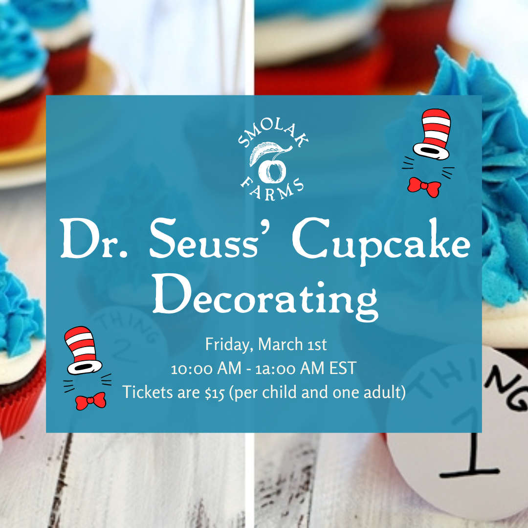Smolak Farms 315 South Bradford Street, North Andover, MA, United StatesJoin us for a Dr. Seuss themed Cupcake Decorating Event! We will be decorating cupcakes, and listening to a reading of a Dr Seuss book. Tickets are $15 (per child and one adult) and include a story, some animal food, 3 cupcakes (a variety of vanilla and chocolate), and all of the supplies you'll need to decorate them!