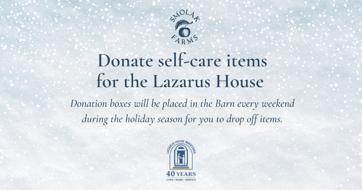 Throughout the holiday season, we will be collecting self-care items for Lazarus House. Donation boxes will be placed in the Barn every weekend. Lazarus House is in need of the following personal care items: Shampoo, conditioner, body wash, Hand & body lotion, Soap, Disposable razors, Toothpaste, toothbrush, dental floss, Combs & hairbrushes, Sunscreen & Lip balm, Feminine hygiene products, Diapers (Sizes 6, 5,4) & Wipes, Similac Advance (Blue Label) Formula, and Socks.