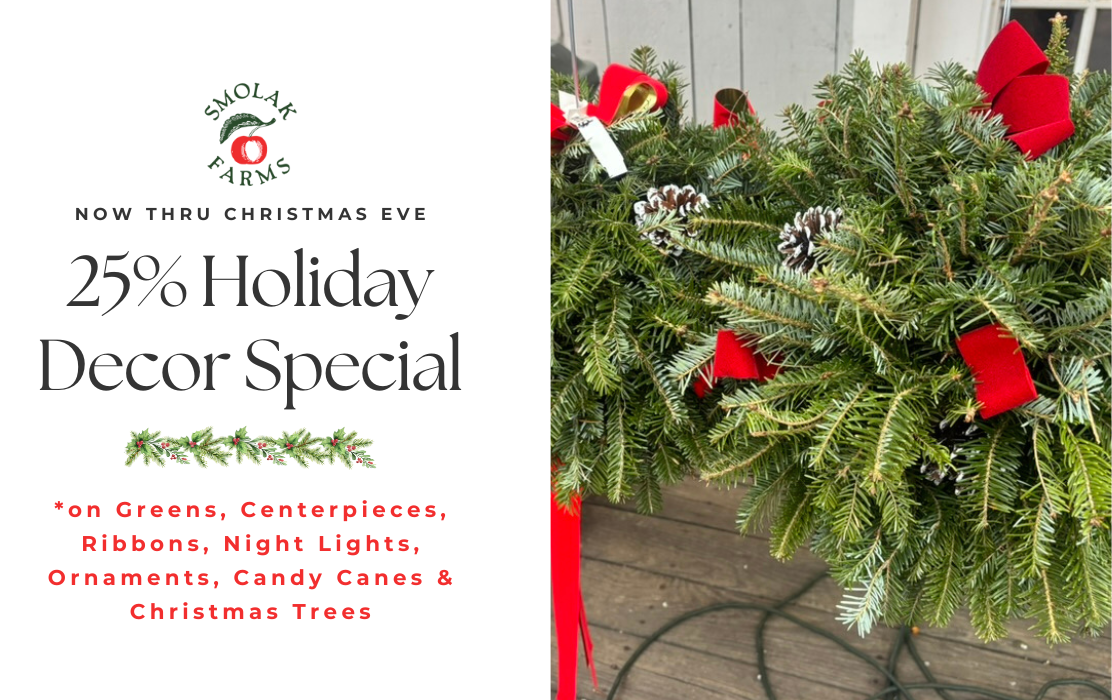 Smolak Farms is celebrating the season with a special holiday sale! Starting 12/10 through Christmas Eve, enjoy 25% off all Greens, Centerpieces, Ribbons, Night Lights, Ornaments, Candy Canes, and Christmas Trees. Visit the Farm Stand daily for fresh treats, festive displays, and everything you need to make your holidays bright. Sale ends December 24th!