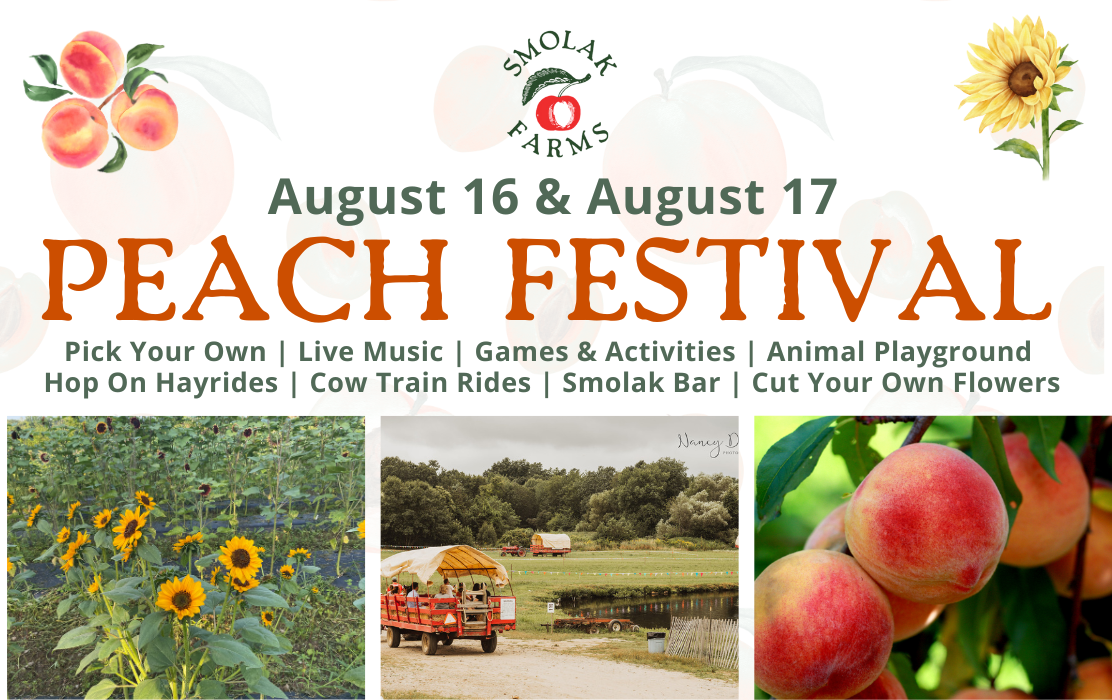 View Larger Image Peach Festival Coming August 16-17 Save the Date! Our Pretty as a Peach Festival returns to Smolak Farms on August 16 & 17! Enjoy hayrides, live music, seasonal treats, face painting, cow train rides, and more. Pick Your Own Peaches and Cut Your Own Flowers. farmhand922025-07-27T10:10:49-04:00July 27th, 2025|Festivals / Kids Activities|