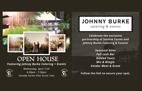 There is still time to join us! On Wednesday, April 17th, from 4:30 to 7:30, we will be hosting a very special Smolak Open House! In addition to guided tours and expert advice from our dedicated wedding and corporate directors, we have an exciting new addition! Johnny Burke Catering will be serving up delectable bites, offering a full cash bar, and facilitating mix and mingling opportunities.